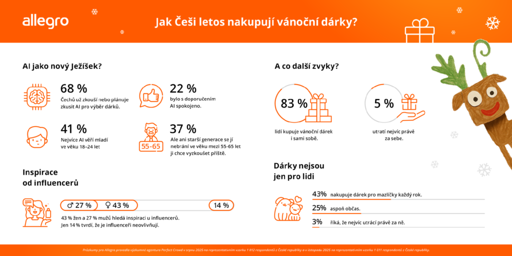 Podle aktuálního průzkumu* Perfect Crowd pro Allegro se letošní vánoční sezona silně ovlivněna umělou inteligencí a online prostředím. Až 68 % Čechů využívá nebo plánuje využít AI při výběru dárků, přičemž nejčastěji ji oceňují mladí lidé ve věku 18 až 24 let. Otevřenost k umělé inteligenci však roste i u starších nakupujících, 37 % respondentů ve věku mezi 55 až 65 let uvedlo, že ji chce v budoucnu při hledání inspirace vyzkoušet. Jen dvě procenta lidí přitom uvedlo, že AI vůbec nezná.